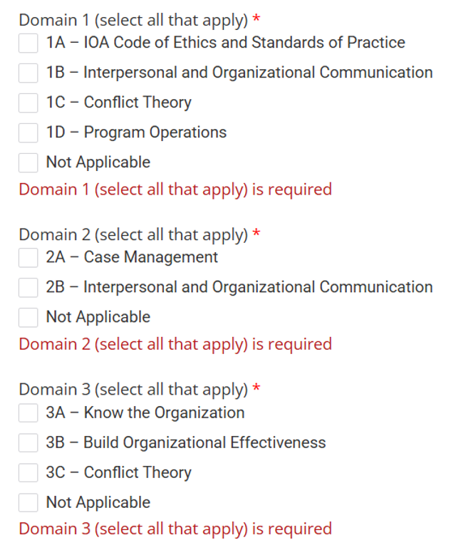 Certification Domains For the purpose of recertification approval from Board of Certification for Certified Organizational Ombudsman Practitioners®, please select which of the following CO-OP® Domains you expect this presentation may satisfy.